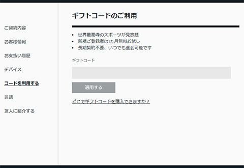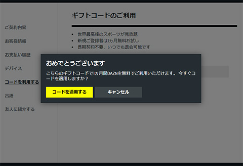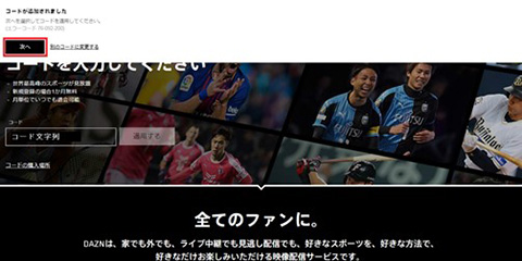 2. コード入力欄にDAZNカードに印刷されている専用コードを入力し、「適用する」を選択