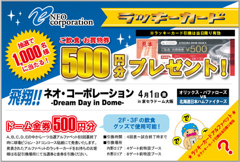 オリックス・バファローズでは、株式会社ネオ・コーポレーションが「飛翔!!ネオ・コーポレーション~Dream Day in Dome~」と称し、4月1日(金)対北海道日本ハムファイターズ戦にゲームスポンサーとして協賛することとなりました。 また、当日は全ゲートで先着3,000名様にラッキーカードを配布いたします。 賞品は1,000名の皆様に京セラドーム大阪内で使用できる「ご飲食・お買物券500円分」をプレゼントいたします。 ぜひ、ご来場ください!