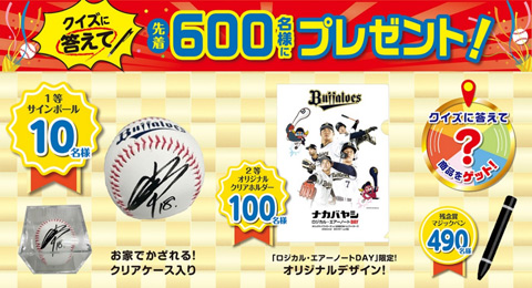 | 抽選会賞品 | ・選手サインボール 10名 ・選手画像入りクリアファイル 100名 当たらなかった方には残念賞としてマジックペンをプレゼント!  |