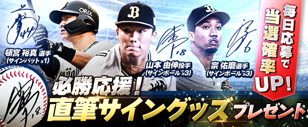 オリックス・バファローズの選手カードをコレクションできる公式のスマホアプリ「B9 STARS(ビーナインスターズ)」では、4月16日(土)17日(日)に開催の「Bs春のファンまつり」に合わせ、プレゼントキャンペーンを実施いたします!実際に選手が使用したバットに、直筆のサインが書かれた激レアなお宝グッズなどが当たる大チャンスです!!