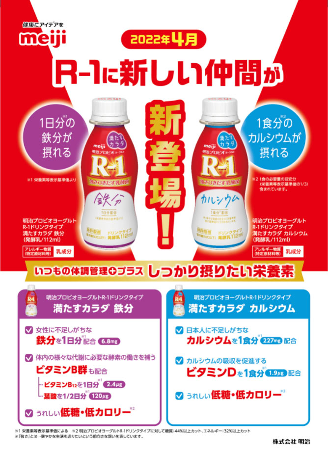 | 商 品 | 明治プロビオヨーグルトR-1ドリンクタイプ 満たすカラダ 鉄分・カルシウム |