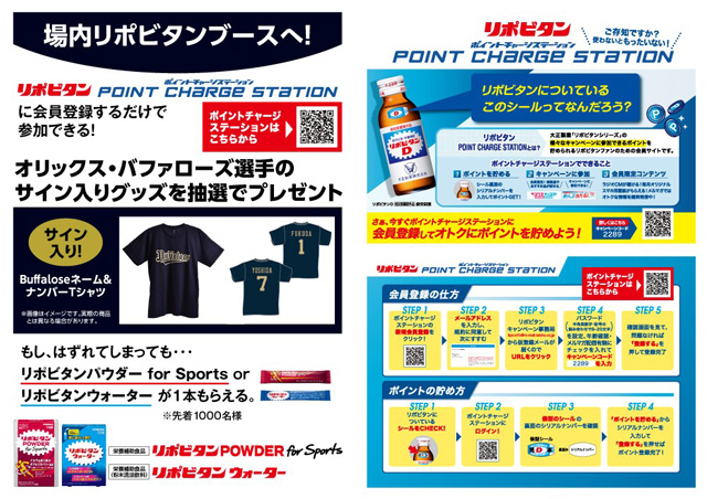 また、リポビタンブースでは、リポビタン ポイントチャージステーションに会員登録いただいたお客様に、バファローズ選手直筆サイン入りネーム&ナンバーTシャツがその場で当たる抽選会に参加できます。