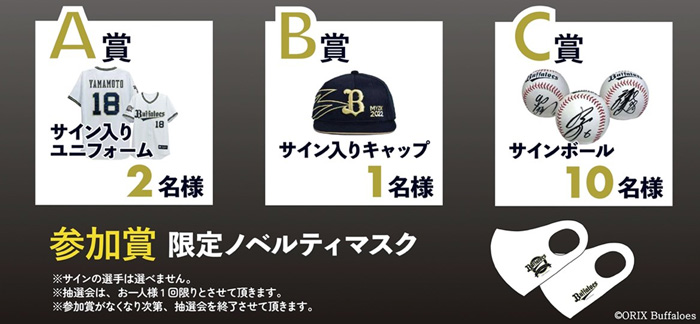 また、「スマートニュースデー」当日はスマートニュースのアプリをご提示もしくはダウンロードしていただいたお客様に、選手のサイン入りグッズがあたり、参加者全員にハズレ無しでバファローズオリジナルマスクが必ずもらえる豪華プレゼント企画も開催いたします。