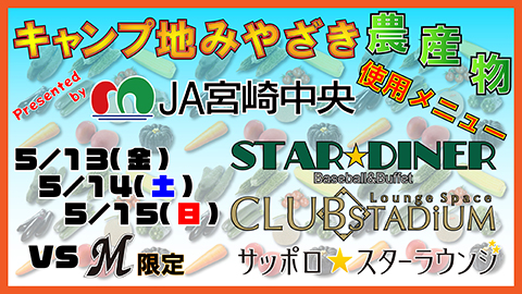5月13日(金)、14日(土)、15日(日)の3日間は、スターダイナー、クラブスタジアム(※各日開店~ゲート開場30分前までの営業時間帯は除く)、そしてサッポロスターラウンジのお食事に、毎年の同シリーズでお馴染みのJA宮崎中央様提供の農産物を使用したメニューをご提供いたします!!