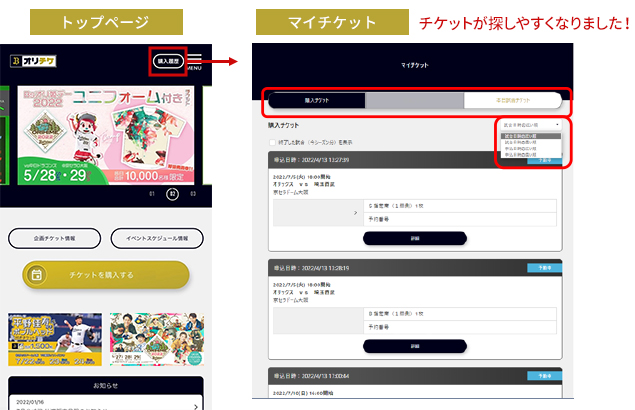 2022年シーズンに購入したチケットがソート機能で並び替えが可能に。