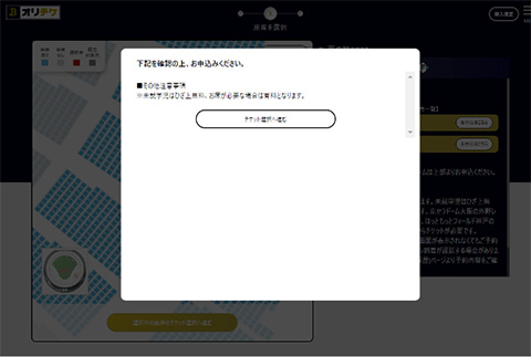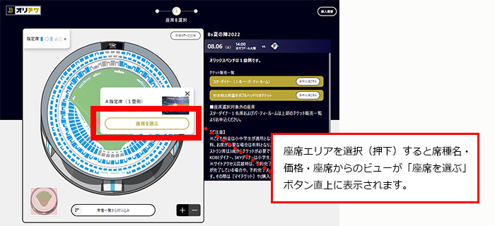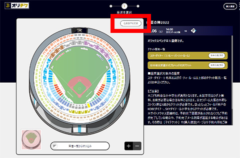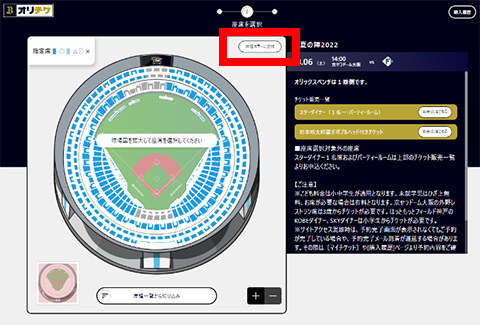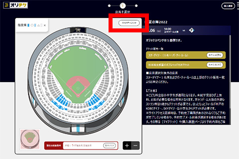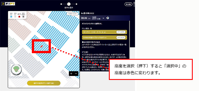 購入を希望する座席エリアを選択し、「座席を選ぶ」を押下し、拡大表示された球場図より座席を選択してください。