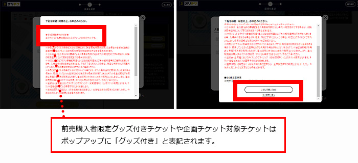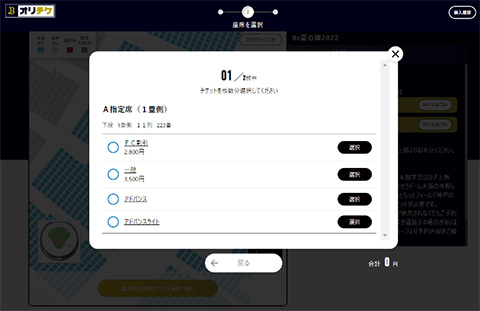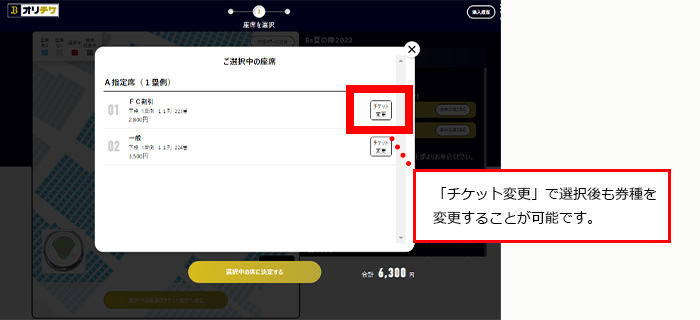座席選択時に表示されるポップアップをご確認後、「チケット選択へ進む」を押下し、チケット枚数分の券種を選択して、「選択中の席に決定する」を押下。