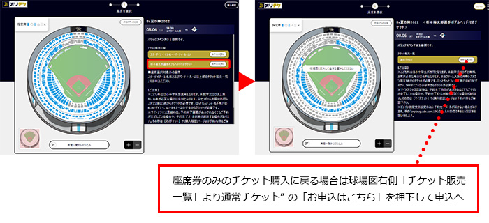 球場図右側の“企画チケット(例:ボブルヘッド付きチケット)” の「お申込はこちら」を押下。