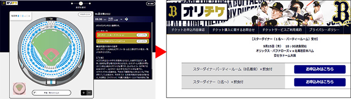 “スターダイナー(1名~・パーティールーム)” または “企画チケット” のお申込は、球場図右側のバナーから。