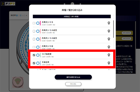 □にチェックを入れ、「選択の席種で絞り込み」を押下すると選択した席種のみ「席種カラー」または「在庫表示」となります。
