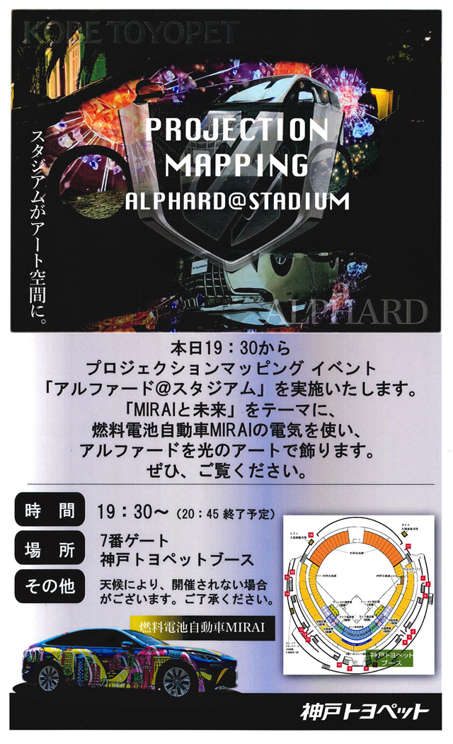 また、当日の19:30頃から、このMIRAIで発電した電気を使ってトヨタの最上級ミニバン『アルファード』にプロジェクションマッピングを行います。
