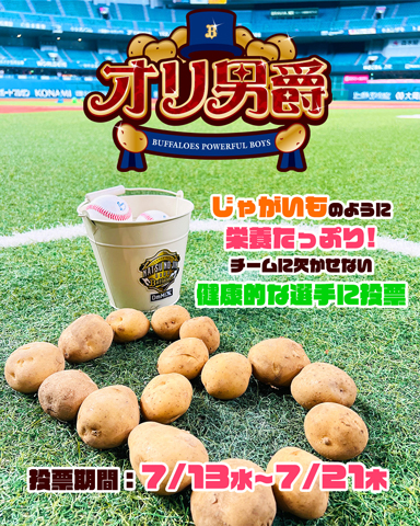 他注意事項はこちらじゃがいものように栄養たっぷりでチームに欠かせない健康的な選手を「オリ男爵」と名付けたファン投票企画を行います。この人こそふさわしい!と思う選手に投票してください。あなたの1票でオリ男爵が決定します!