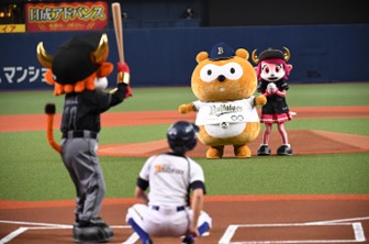 バファローズパパポンタ&バファローズ☆ポンタの親子とBsGirlsがコラボ!「たぬきダンス」のパフォーマンスを3回裏終了時のグラウンド上で踊ります!