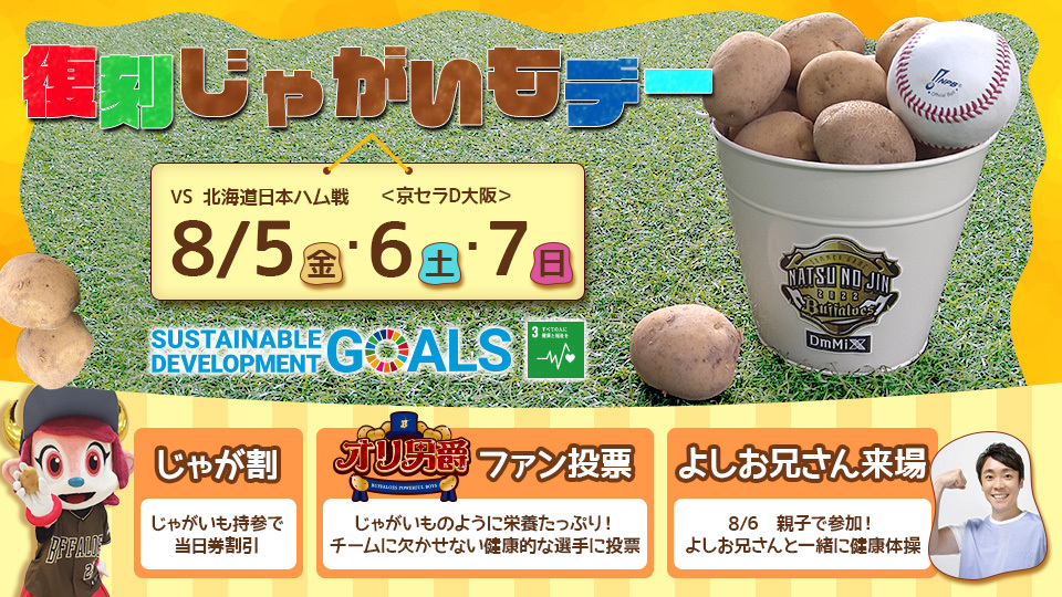 8月5日(金)~7日(日)にSDGs推進活動として健康をテーマにした「復刻じゃがいもデー」を行います。初日となる8月5日(金)試合前に「じゃがいもリレー」の開催決定!バトンは、なんとじゃがいも!?バトンのじゃがいもをつないでリレー対決を行います。見事勝利したチームにはプレゼントをご用意しております!京セラドーム大阪のグラウンドを走るじゃがいもリレーに参加して、より健康になりましょう!皆様のご応募をお待ちしております!
