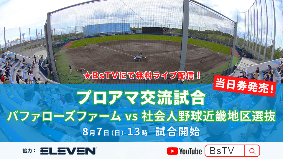 このプロアマ交流試合を、イレブンスポーツ協力のもと、球団公式YouTubeチャンネル「BsTV」にて独占ライブ配信を行います。