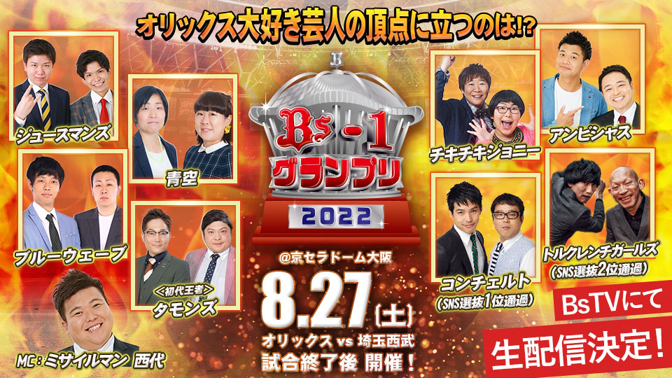 オリックス・バファローズでは、8月27日(土)試合終了後に「第2回Bs-1グランプリ」を開催いたします。当日は、試合観戦時のお席のままスタンドからご観覧いただけますので、ぜひ最後までお楽しみください。そして、球団公式YouTubeチャンネル「BsTV」にて生配信も決定!見逃さないよう事前にチャンネル登録をお願いします。