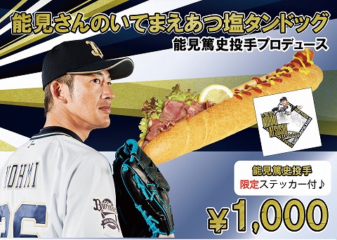 | 商品紹介 | 『能見さんのいてまえあつ塩タンドッグ』 スモークした豚タンを能見篤史投手こだわりの食べ方であるゴマ油と塩ダレで味付けしたボリュームたっぷりのドッグです! |
