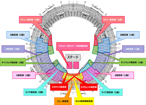※(1)「クラッカー付ステージ特別観覧席」は、演出の都合上、開演~30分間はグラウンド内のステージ特別観覧席に通ずる入口を一時利用できません。お早めにご着席ください。