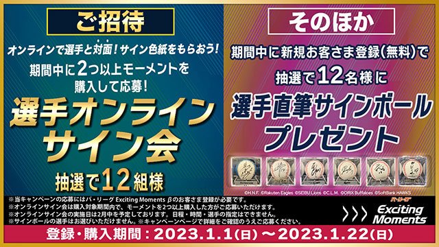 パ・リーグ Exciting Moments β ではただいま「期間中に2つ以上購入で選手とのオンラインサイン会にご招待!」キャンペーンを実施中!
