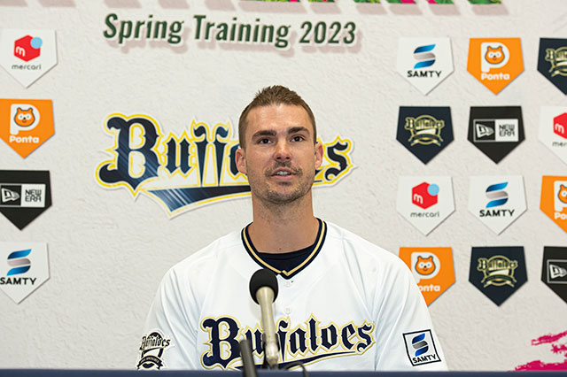 昔から交流のある中垣コーチと日本に興味があるということなど、色々と話をしていたんですが、今回それが叶うことになって本当に嬉しく思っています。(日本の野球のイメージは)努力家の人が多いということと、基礎を大事にしているという印象ですね。バファローズは昨年日本一だと聞いていますし、強いチームなので、自分もその日本一に貢献できるようにがんばりたいと思っています。先発ピッチャーとして、一年間ケガ無く投げ抜くということが今年の目標です。