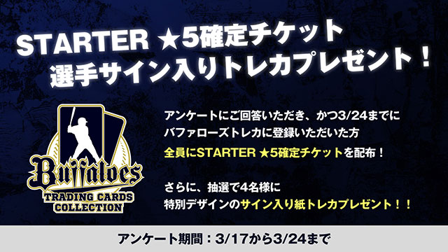 アンケートにお答え頂き、バファローズトレカにご登録いただいたすべての方に、サービス内で使える「STARTER ☆5確定チケット」を1枚、さらに抽選で4名様にサイン入り「リアルトレカ」をプレゼントいたします。