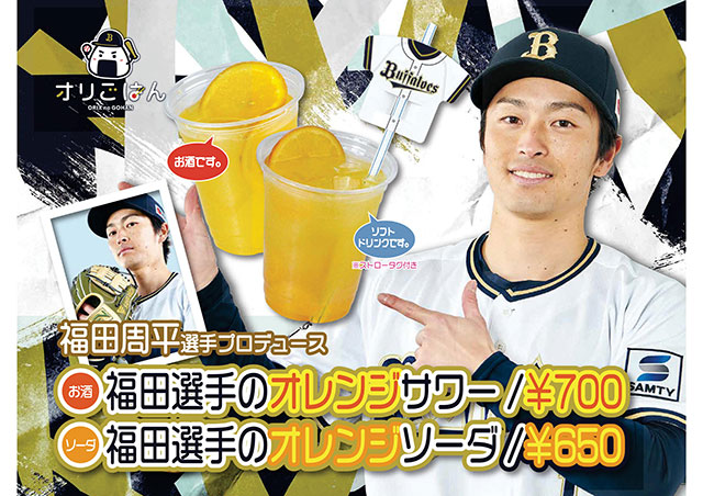 | 商品紹介 | 『福田選手のオレンジサワー』※お酒 『福田選手のオレンジソーダ』 大好きな果実のオレンジをトッピングしたオレンジベースのドリンクをさっぱりとした味に仕上げました。 |