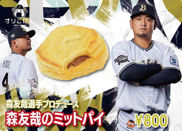 | 商品紹介 | 『森選手のミットパイ』 森選手のグローブをイメージしたミートパイ。大好きなお肉にトマトフィリングを加えてパイに詰め込みました♪ |