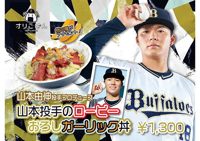 | 商品紹介 | 『山本投手のロービーおろしガーリック丼』 山本投手が好きなペペロンチーノソースに柿の種の食感がアクセントになるローストビーフ丼! |