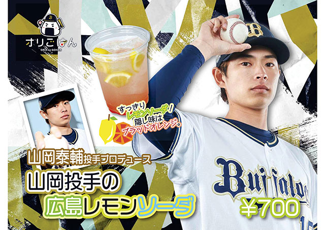 | 商品紹介 | 『山岡投手の広島レモンソーダ』 山岡投手の出身地・広島県特産の広島レモンのシロップと果肉を 使用したドリンクを販売!すっきり、爽やかな味です♪ |