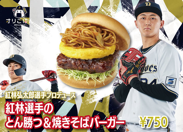 | 商品紹介 | 『紅林選手のとん勝つ&焼きそばバーガー』 大好きなトンカツと焼きそばを合わせた京セラドーム大阪限定の オリジナルバーガーです。 |