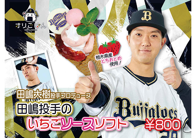 | 商品紹介 | 『田嶋投手のいちごソースソフト』 田嶋投手の出身地・栃木県の特産「とちおとめ」を使用したソースと、とちおとめジャムをソフトクリームにトッピング♪ イチゴ好きにオススメの一品です。 |