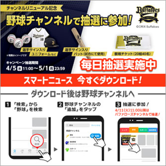 スマートニュース株式会社(東京都渋谷区、代表取締役:鈴木健)は、プロ野球開幕に合わせ、オリックス・バファローズと特別プレゼントが当たる応援キャンペーンを開催することとなりましたので、お知らせいたします。
