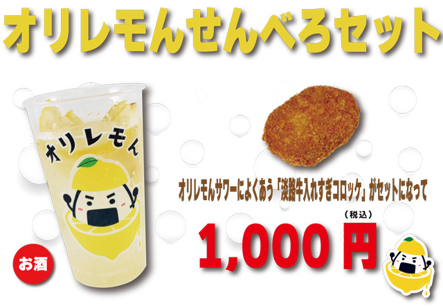 新メニューの「オリレモんサワー」と「淡路牛入れすぎコロッケ」がセットになったせんべろセットです!
