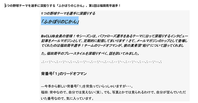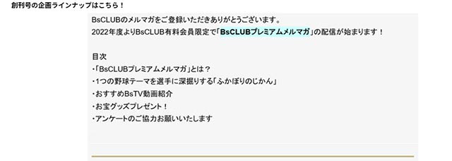 昨年からスタートした「プレミアムメルマガ」は、選手の野球に対する考え方などがわかる深ぼり記事をはじめ、直筆サイングッズプレゼントなどメルマガならではの企画を計画しています。