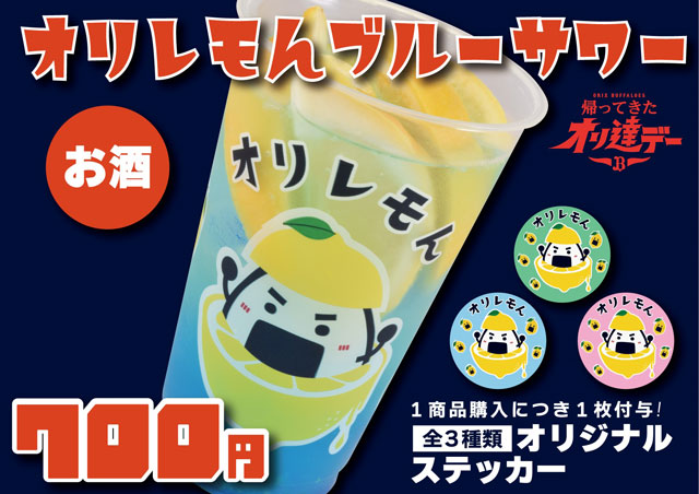 Bsオリ達デー限定の青いオリレモんサワー登場! 1点お買い上げ毎に「オリレモんステッカー」を1枚お渡しいたします。 |