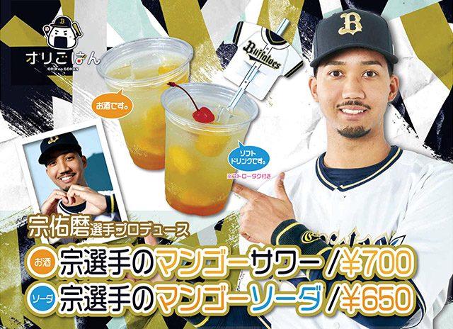 | 商品紹介 | 『宗選手のマンゴーサワー』※お酒 『宗選手のマンゴーソーダ』 マンゴーが好きなので、マンゴーシロップにマンゴーの果肉を加えたマンゴーづくしのメニューを考えました! |