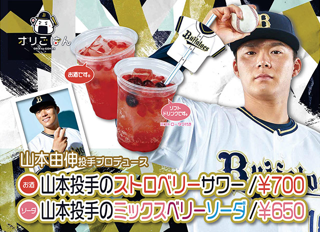 | 商品紹介 | 『山本投手のストロベリーサワー』※お酒 『山本投手のミックスベリーソーダ』 イチゴの果肉にイチゴシロップを加えたイチゴづくしのドリンクを考えました。ぜひご賞味ください。 |