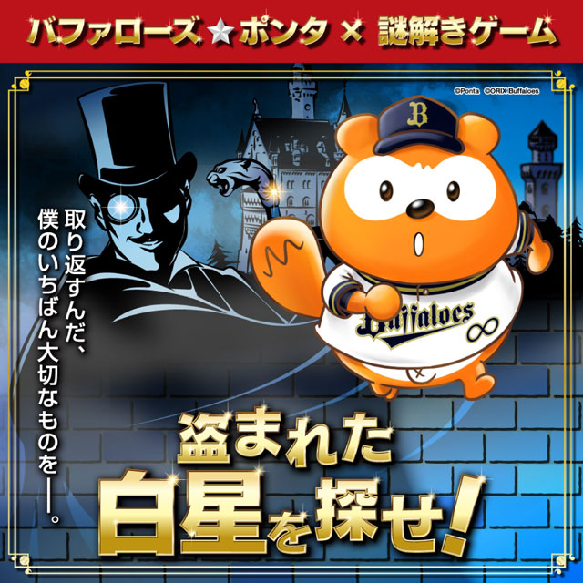 ある日、バファローズ☆ポンタの名前に入っている白星(☆)が、謎の怪盗によって盗まれてしまった。勝利の願いを込めた白星がなくなってしまうと、バファローズの勝ち星に影響してしまうかもしれない…と不吉な思いを抱くバファローズ☆ポンタ。キミに、奪われた白星を一緒に取り返す手伝いをしてほしいんだ!