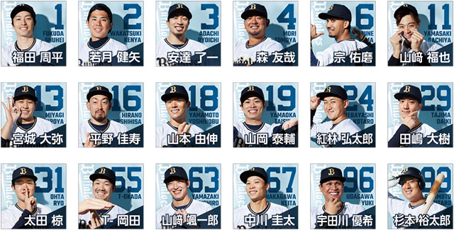 | 選手 | 18選手(福田・若月・安達・森・宗・山崎福・宮城・平野佳・山本・山岡・紅林・田嶋・太田・T-岡田・山崎颯・中川圭・宇田川・杉本) |