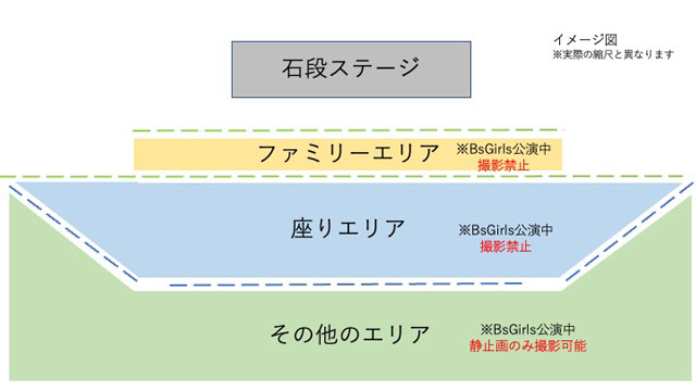 ※ファミリーエリア・座りエリアはBsGirls公演中は撮影禁止。その他のエリアはBsGirls公演中静止画のみ撮影可能。