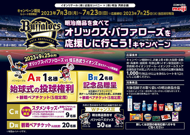 近畿2府4県のイオンリテール・イオンリテールストア店舗各店で、「明治商品を食べてオリックス・バファローズを応援しに行こう!キャンペーン」を実施中!この機会にぜひご応募ください!
