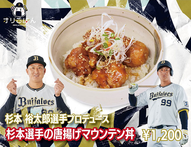 | 商品紹介 | 『杉本選手の唐揚げマウンテン丼』 ニンニクを効かせたパワフルでボリュームもマンテンな唐揚げ丼です。  |