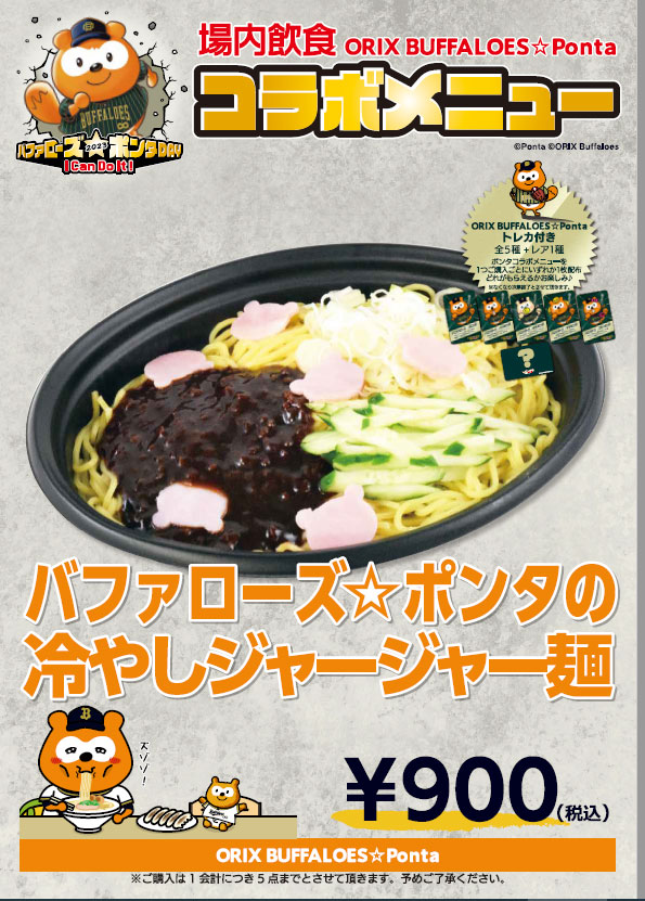 8月26日(土)の「バファローズ☆ポンタDAY 2023」に合わせ、25日(金)~27日(日)の3日間限定でバファローズ☆ポンタコラボメニューが登場!「場内飲食売店」および「バファローズ☆ポンタ縁日(1Fバス乗降場)」にて販売いたします。