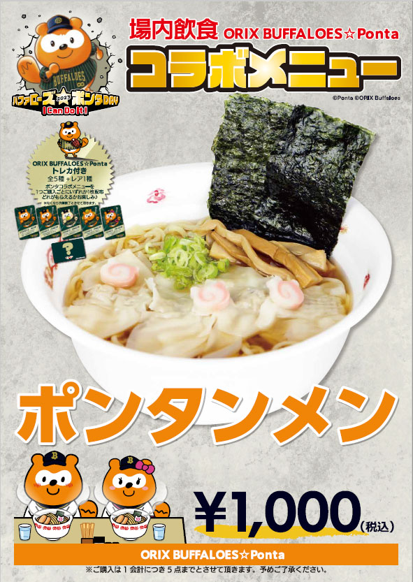 各メニューをご購入いただくと、バファローズ☆ポンタトレーディングカードが1枚付いてきます♪ご来場の際は、ぜひ販売店舗にお立ち寄りください。