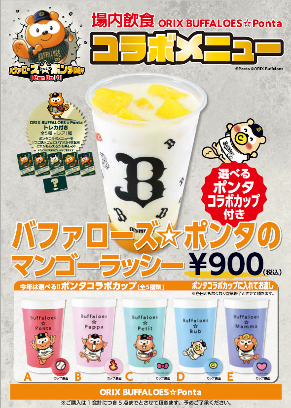| 商品名 | バファローズ☆ポンタのマンゴーラッシー〔ソフトドリンク〕 【バファローズ☆ポンタコラボカップ入り】  |