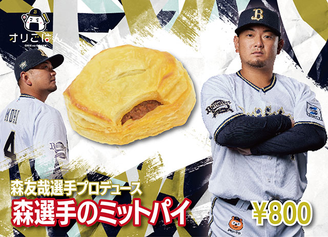 | 商品紹介 | 『森選手のミットパイ』 森選手のグローブをイメージしたミートパイ。大好きなお肉にトマトフィリングを加えてパイに詰め込みました♪ |