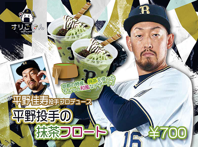 | 商品紹介 | 『平野投手の抹茶フロート』 平野投手の出身地・京都の特産抹茶にあんことソフトクリームを使用したドリンクを作りました。 |