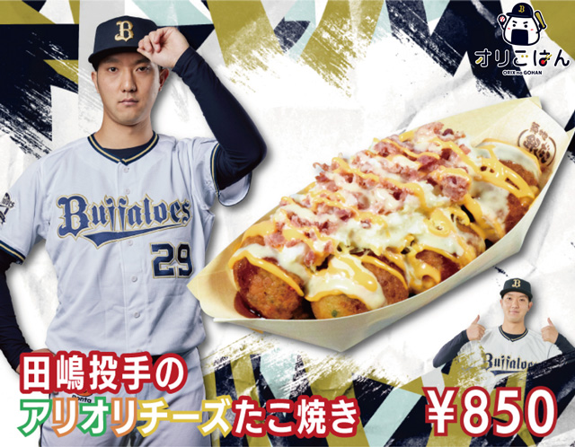 | 商品 | 『田嶋投手のアリオリチーズたこ焼き』 ガーリック風味のソースにチーズをたっぷりかけたチーズ好きにはたまらないたこ焼き! |