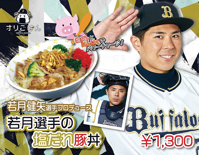 | 商品紹介 | 『若月選手の塩だれ豚丼』 若月選手と言えば豚丼!今回は塩だれの豚丼を企画いたしました。 |