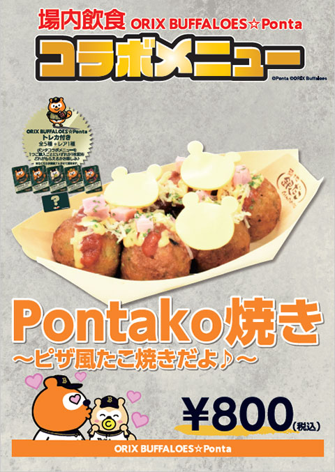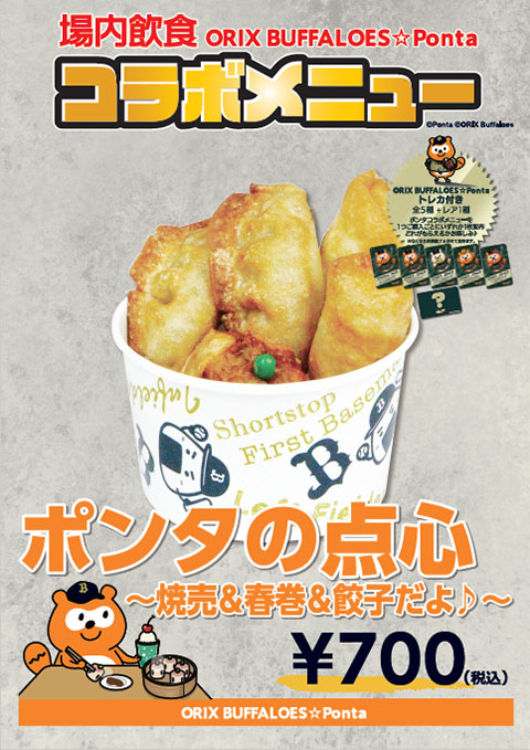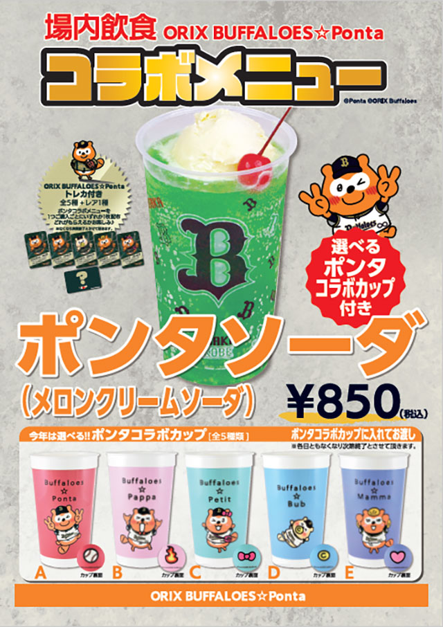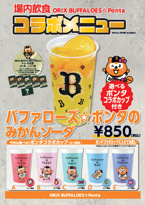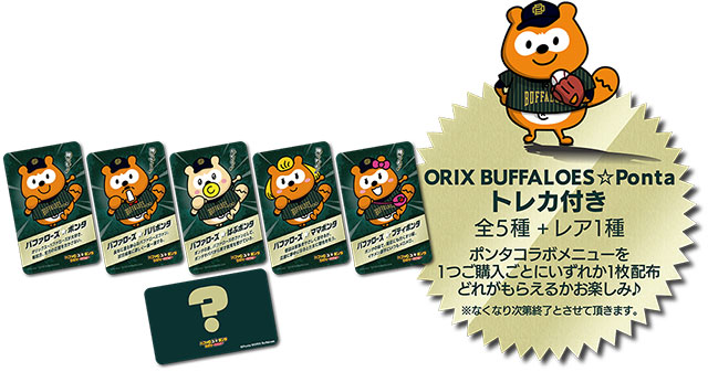 各メニューをご購入いただくと、バファローズ☆ポンタトレーディングカードが1枚付いてきます♪ご来場の際は、ぜひ販売店舗にお立ち寄りください。